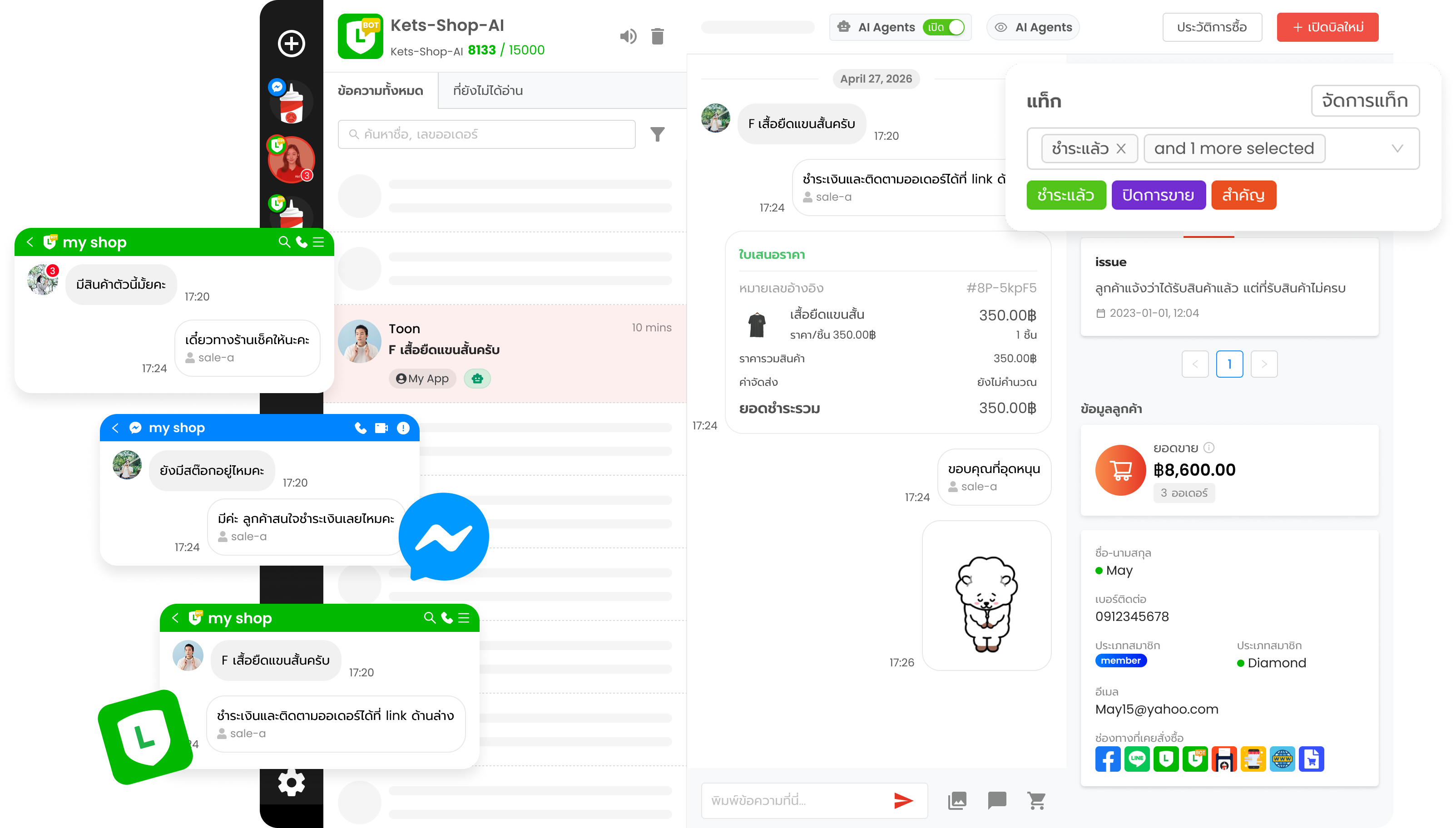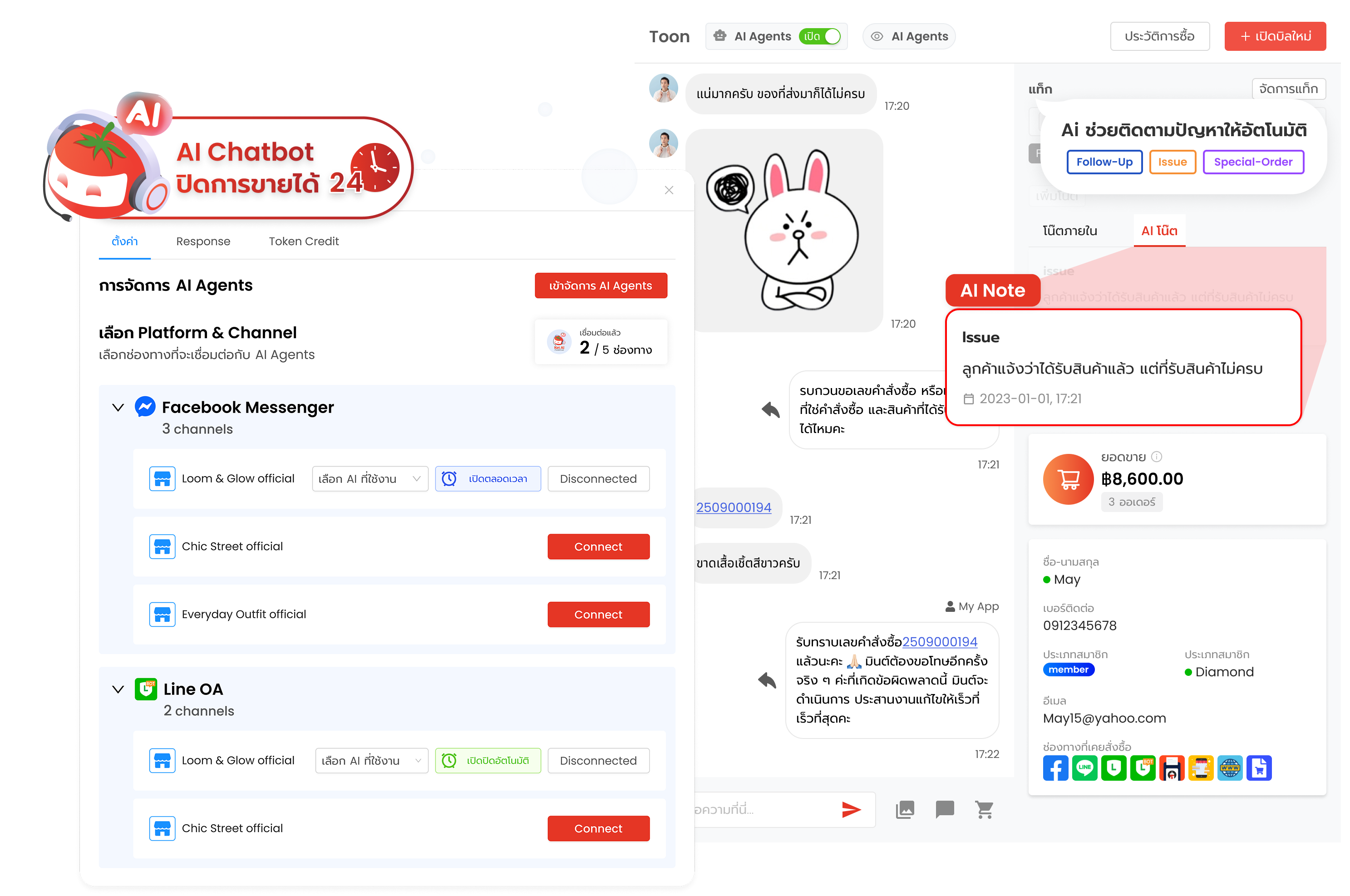 AI ที่ช่วยทีมงานทำงานเร็วขึ้น ไม่ใช่แทนที่ — ตอบแชทอัตโนมัติ สรุปบทสนทนา จัดหมวดหมู่ออเดอร์ และวิเคราะห์แนวโน้ม
