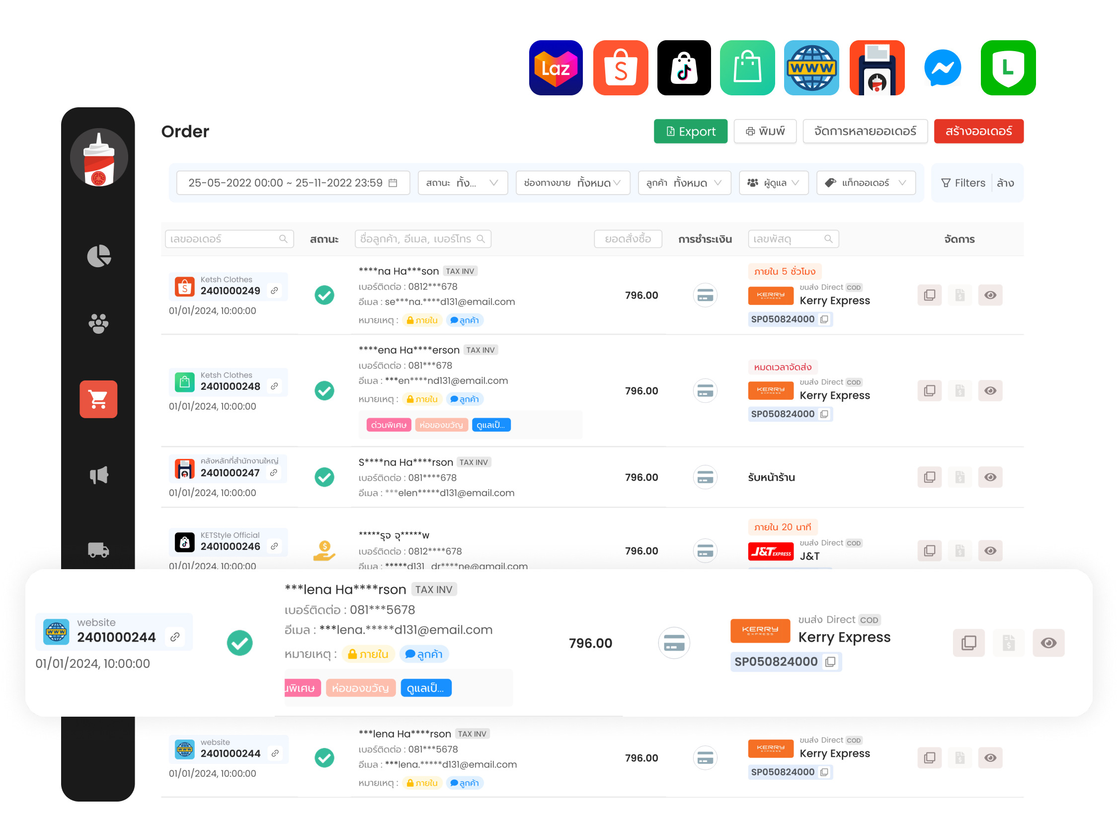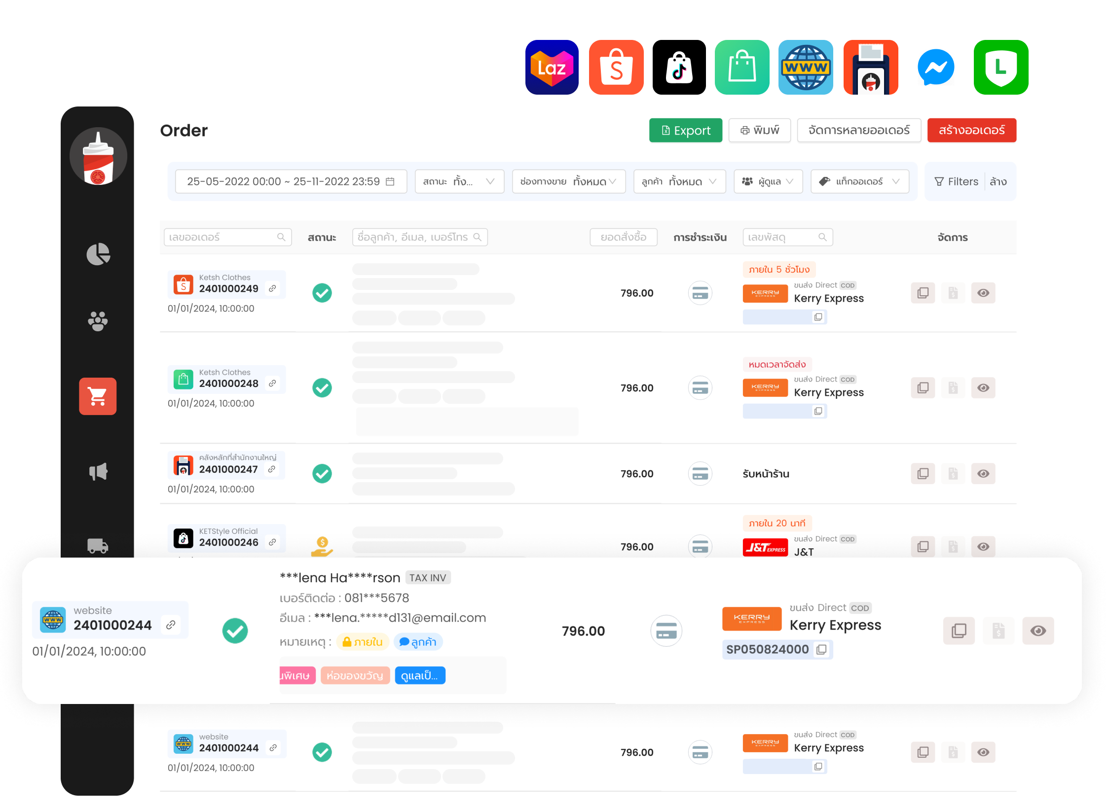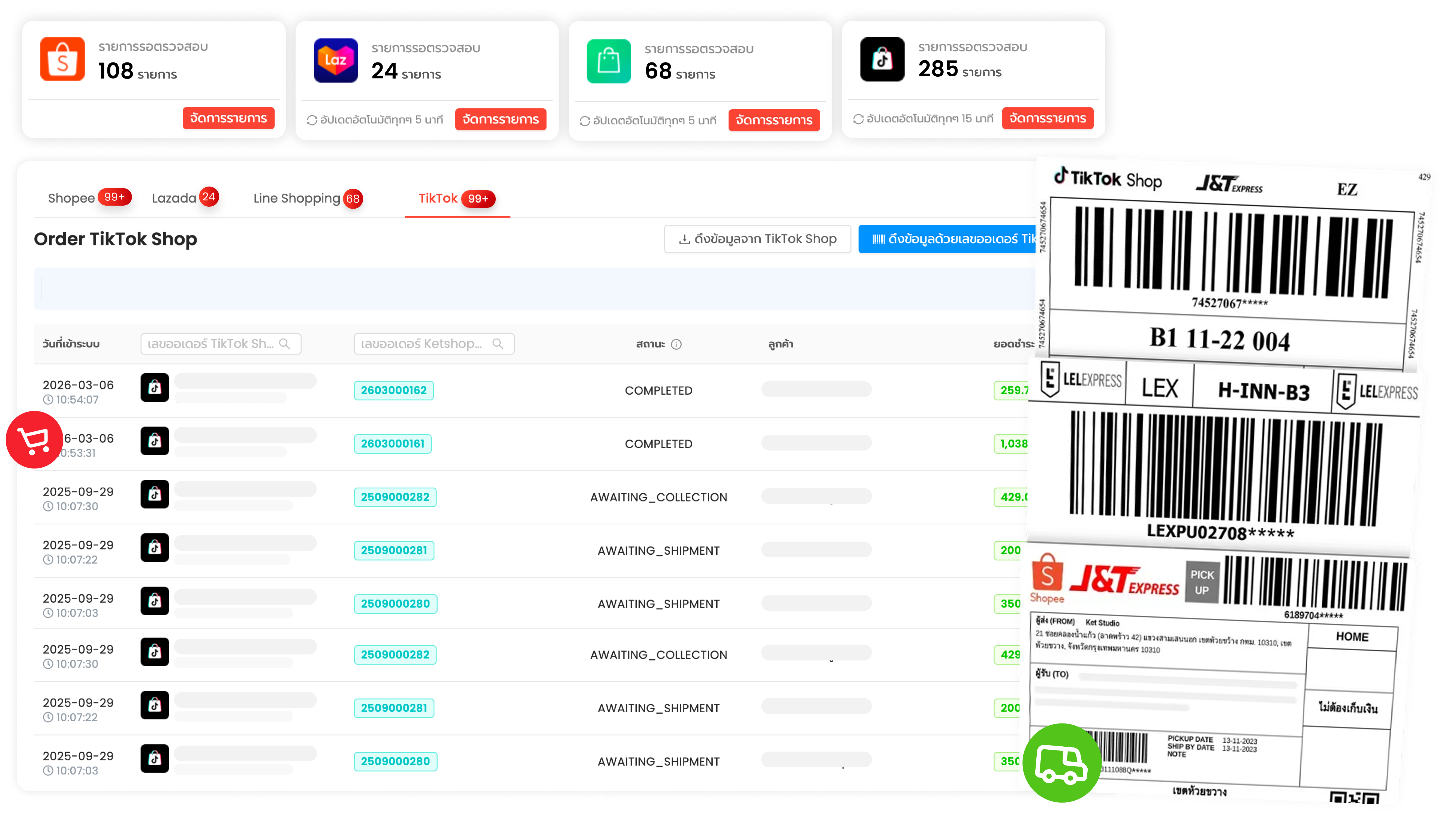 ดึงออเดอร์จาก Shopee, Lazada, TikTok Shop, LINE Shopping มาจัดการในที่เดียว อัพเดตสถานะ ตัดสต็อก พิมพ์ใบปะหน้าได้ทันที