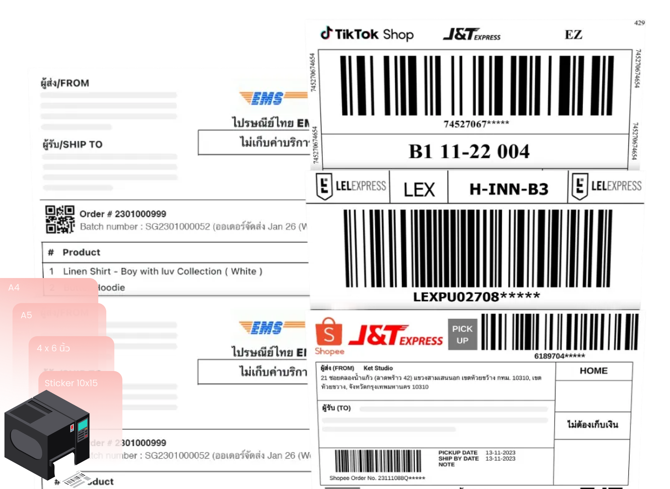 พิมพ์ใบปะหน้าพัสดุ ใบเสร็จ ใบส่งสินค้า ได้ทุกขนส่ง รองรับ A4, A5, สติกเกอร์ 10x15